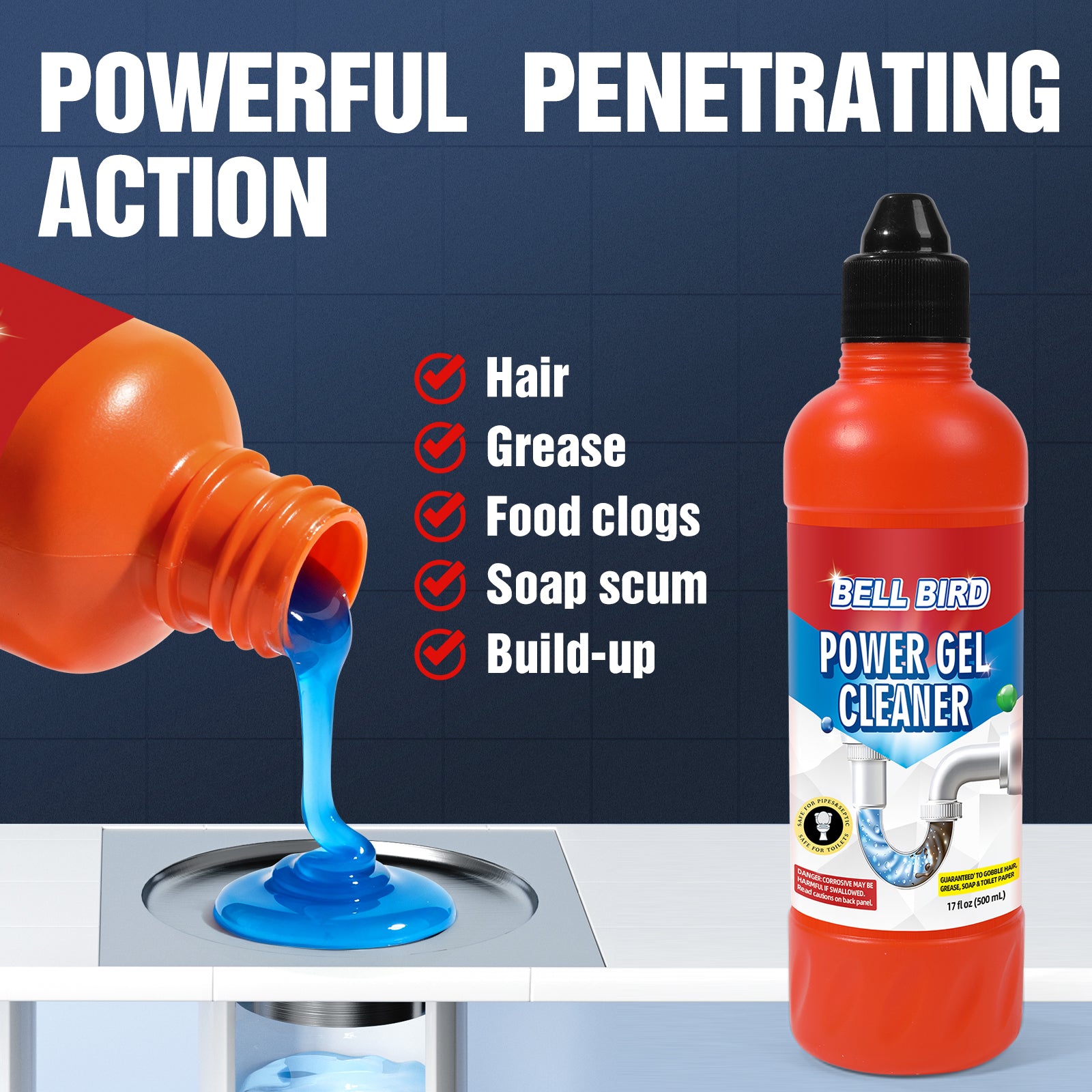 ADVANCED THICK GEL FORMULA: Unlike watery cleaners that wash away, Bell Bird uses a high-density gel formula that is heavier than water. It cuts straight through standing water to reach the clog and clings to pipe walls, liquefying tough hairballs, grease, and soap scum within hours.